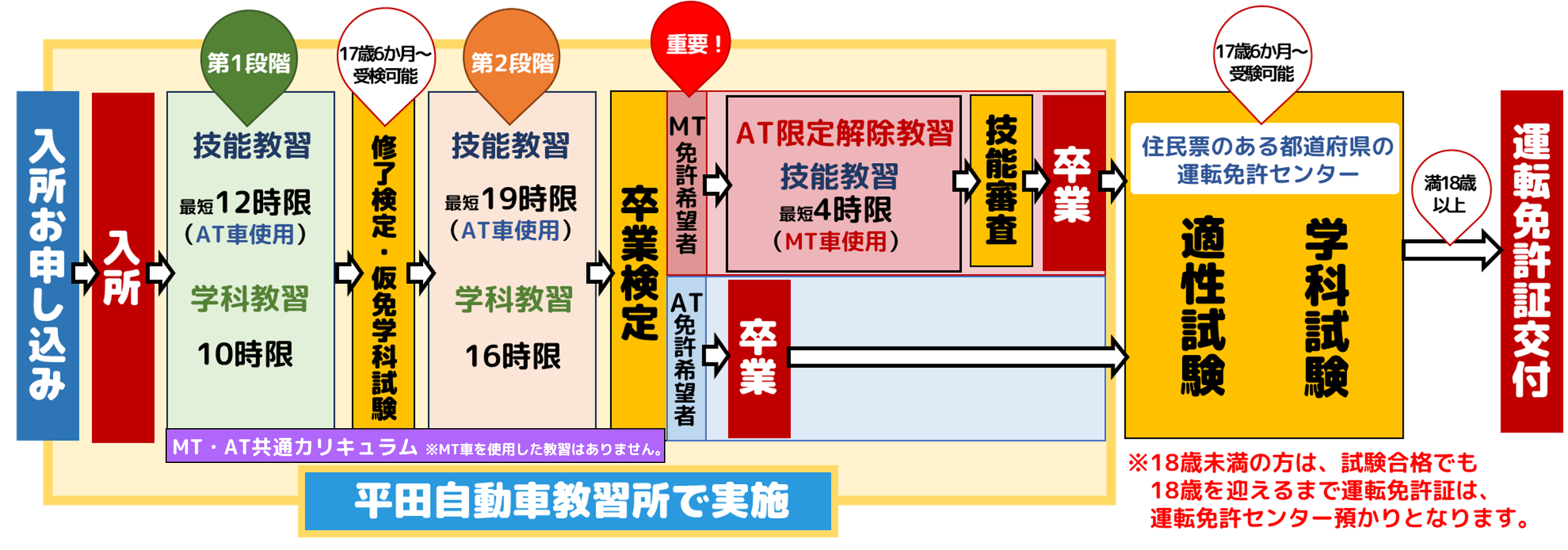 普通車免許はAT自動車での通所日数は14日~、MT自動車での通所日数は16日~。 準中型免許の通所日数は18日~。入所説明ページ.png)